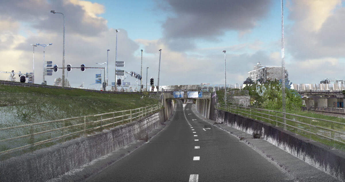 In 2017 hebben we voor de eerste keer de Ring mobiel gescand met onze Streetmapper-IV. Van de ingewonnen data hebben we toen een Digitaal Terreinmodel (DTM) gerealiseerd. In 2020 hebben we het traject opnieuw gescand, toen hebben we heel specifiek alle bomen in kaart gebracht. Zo hebben we de diameter en de kruin van de boom uitgetekend. Ook staan in dit DTM alle faseringen. Alle metingen passen wij iedere keer in zodat er een up-to-date DTM ontstaat. Doordat we met de hand bij meten voegen we ook alle tijdelijke wegen toe aan het DTM. De scan van 2020 hebben we vergeleken met de scan van 2017. Hiervan hebben we een verschillenkaart gemaakt in QGIS. Eén scan wordt dus gebruikt voor verschillende doeleinden. Dit noemen wij éénmalig inwinnen voor meervoudig gebruik!