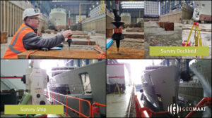 Met ons Total Station meten we het dockbed en het schip nauwkeurig in. Geconstateerde maatverschillen worden direct gerapporteerd en aangepast door de dock-master. Na afloop verwerken wij direct de resultaten in een net meetrapport dat wij aan onze opdrachtgevers leveren.
